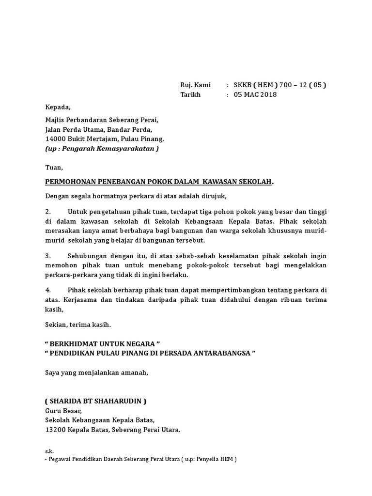 Contoh Surat Mohon Tebang Pokok Di Kawasan Sekolah
